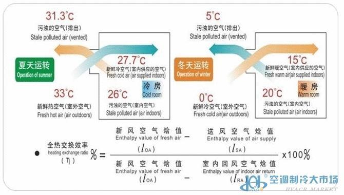全热交换器工作原理是:产品工作时,室内排风和新风分别呈正交叉方式流经换热器芯体时,由于气流分隔板两侧气流存在着温差和蒸汽分压差,两股气流通过分隔板时呈现传热传质现象,引起全热交换过程。夏季运行时,新风从空调排风获得冷量,使温度降低,同时被空调风干燥,使新风含湿量降低;冬季运行时,新风从空调室排风获得热量,温度升高。这样,通过换热芯体的全热换热过程,让新风从空调排风中回收能量。